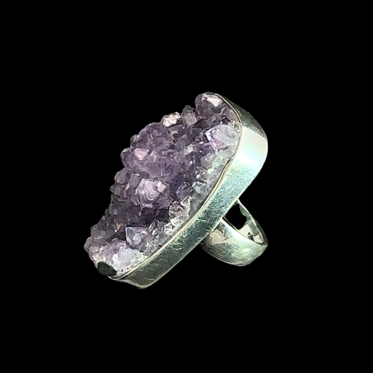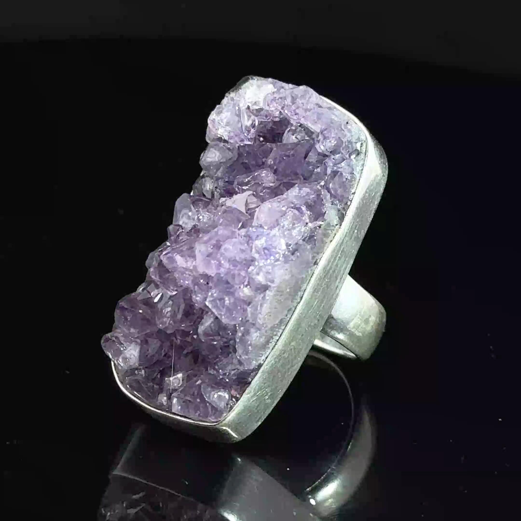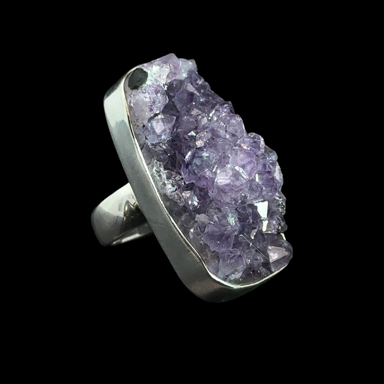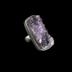 Magnifique bague en argent 925 et en améthyste brute. Sa forme rectangulaire et ses cristaux en font une pièce originale.